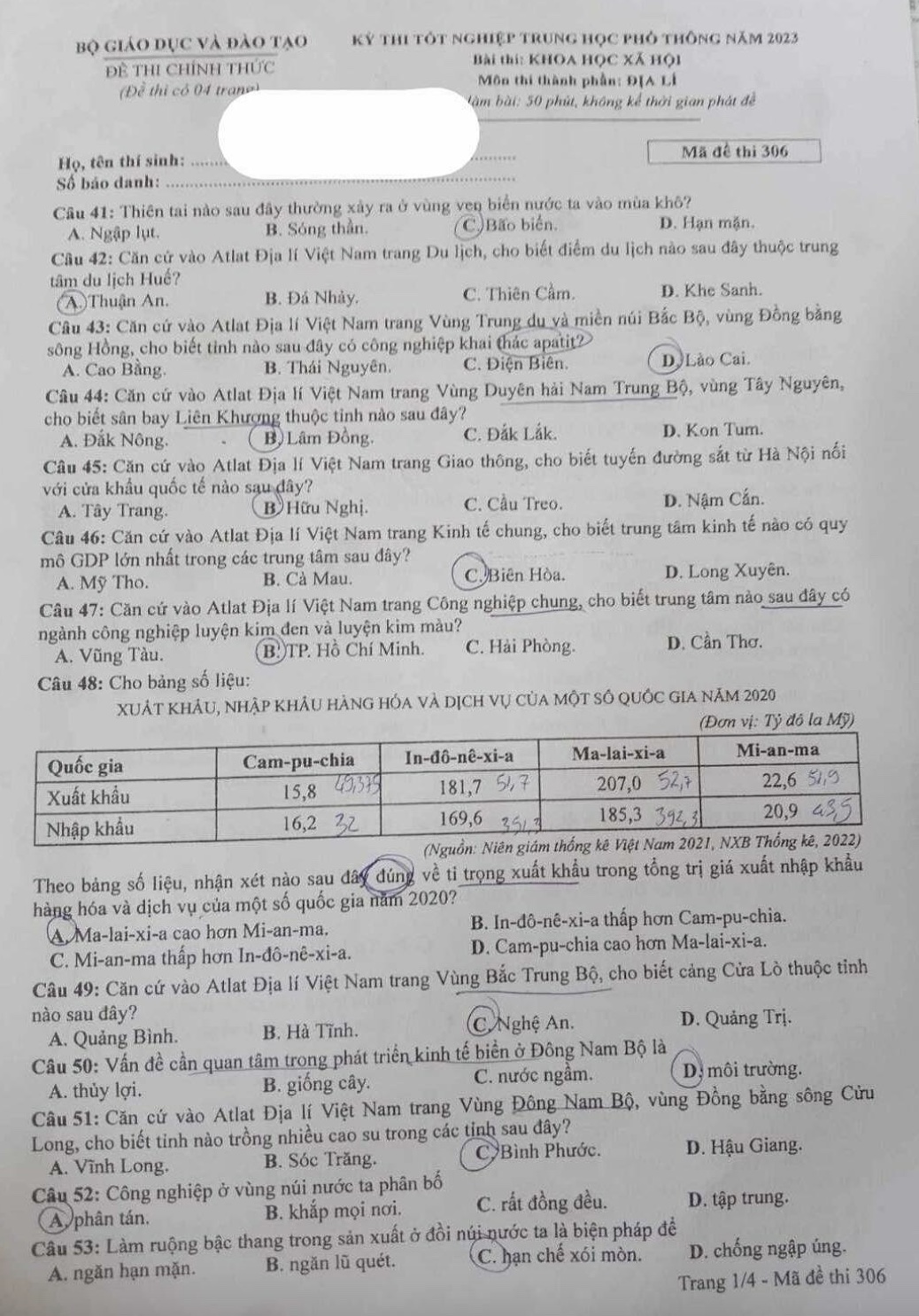 Đề môn Địa lý thi tốt nghiệp THPT 2023